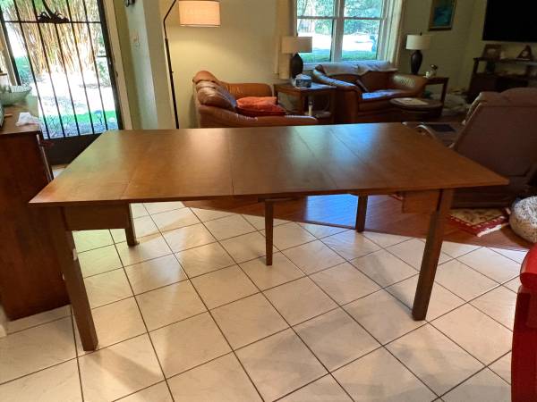 Wood table that measures 20x40 closed, then opens to 40x40. Using leaves can expand to 40x56 or 40x72. Each leaf is 16 inches. Could be used for crafts, dining, games or card table, etc.